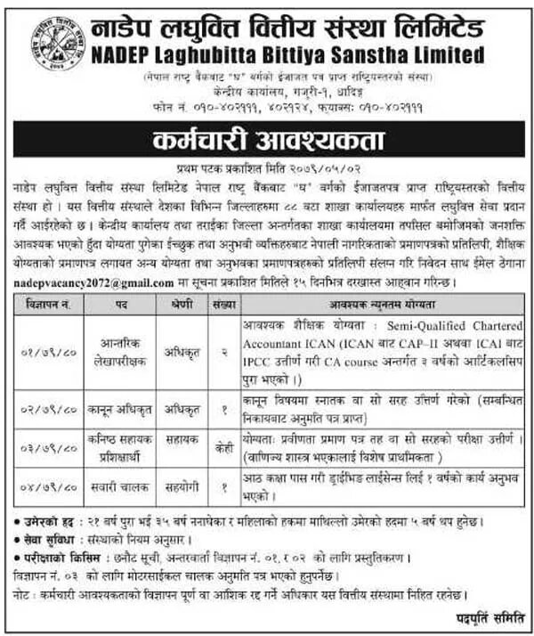 नाडेप लघुवित्तले विभिन्न पदका लागि कर्मचारीको माग गरेको छ ।