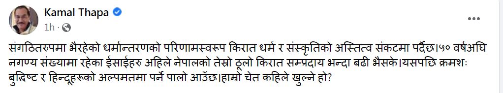 राप्रपा नेपालका अध्यक्ष कमल थापाले संगठित रूपमा भइरहेकाे धर्म परिवर्तनकाे कारणले किरात धर्म र संस्कृतिकाे अस्तित्व संकटमा परेकाे बताएका छन् । अध्यक्ष थापाले सामाजिक सञ्जालमार्फत साेमबार यस्ताे बताएका हुन् ।