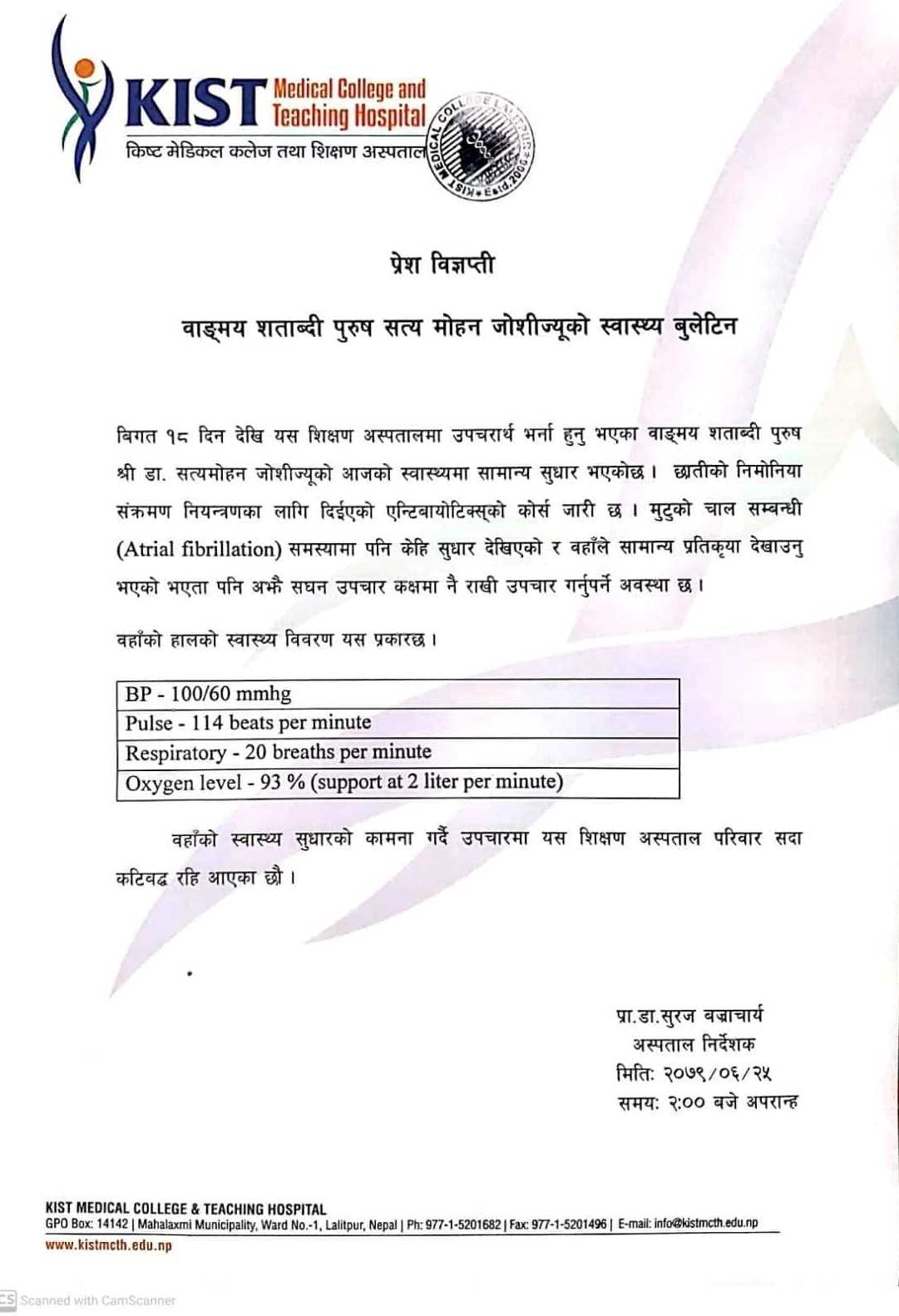 १८ दिनदेखि उपचाररत वाङमय शताब्दी पुरुष सत्यमोहन जोशीको स्वास्थ्यमा सामान्य सुधार आएको छ ।