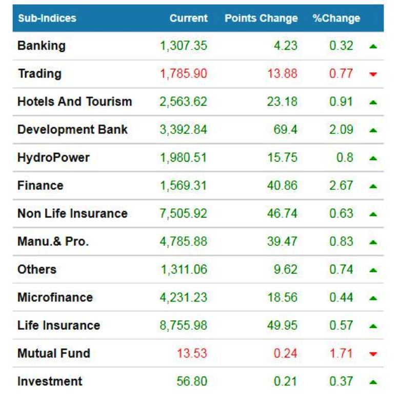 १३ उपसूचकमध्ये आज म्युचुअल फण्ड र व्यापार समूह बाहेकका सबै सूचकमा हरियाली छाएको छ । सर्वाधिक फाइनान्स समूहको २.६८ प्रतिशत र विकास बैंक समूहको २.०९ प्रतिशतले बढेको छ ।