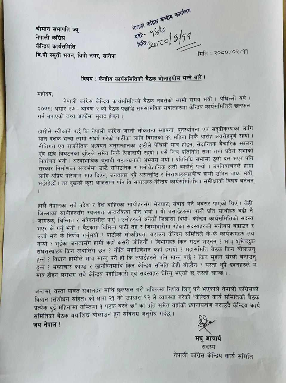 पार्टीको केन्द्रीय कार्यसमितिको बैठक बोलाउन माग गर्दै नेपाली काँग्रेसका केन्द्रीय सदस्य मधु आचार्यले केन्द्रीय कार्यालयमा ध्यानाकर्षण पत्र दर्ता गराएका छन् । आचार्यले विगत ११ महिनादेखि केन्द्रीय कार्यसमितिको बैठक नबसेको भन्दै तत्काल बैठक बोलाएर चुनावी समीक्षासहित विभिन्न समसायिक विषयमा धारणा बनाउनु पर्ने माग गरेका हुन् ।