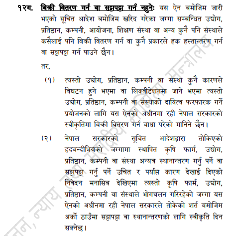 भूमि सम्बन्धि ऐन अनुसार भित्री मधेश र तराई क्षेत्रमा अधिकतम १० बिगाहासम्म जग्गा जमिन राख्न पाइन्छ । यस्तै, काठमाडौं उपत्यकामा २५ रोपनी र काठमाडौं उपत्यकाबाहेक सम्पूर्ण पहाडी क्षेत्रमा ७० रोपनी जग्गा राख्न पाउने व्यवस्था छ । तर, कुनै व्यक्ति वा उसको परिवारले घरबारीको लागि भित्री मधेश र तराई क्षेत्रमा १ बिगाहा, काठमाडौं उपत्यकामा र उपत्यका बाहिरको पहाडी क्षेत्रमा ५÷५ रोपनी जग्गा थप गरी राख्न पाउने व्यवस्था ऐनमा गरिएको छ ।