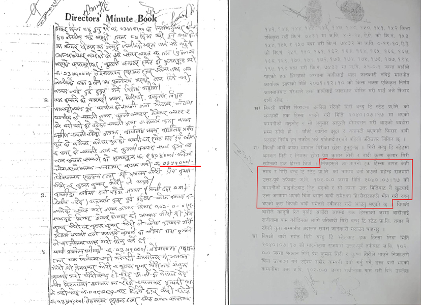 लगानीकर्ताबाट टि–स्टेटका अध्यक्ष छत्र गिरीले १ अर्ब रुपैयाँ लिइसकेको स्रोतको दाबी छ । कम्तीमा २ अर्ब ‘प्रक्रिया मिलाउँदा’ खर्च भएको छ । राजनीतिक दलका नेता, कर्मचारी, मन्त्रीसम्मलाई यो रकम बाँडिएको शंका छ । स्रोतका अनुसार यो सेटिङमा मल्होत्राले एक सय बिघा पाउने छन् । विष्णु राईलगायत केही स्थानीयले ९९ बिघा लिनेछन् । बाँकी रहेको ८१ बिघा स्वयम् गिरीले राख्ने समझदारी छ । केही जग्गा बाटोमा पनि गएको छ । पहिलो चरणमा २४३ बिघा १ कट्ठा १० धुर जग्गा तुरुन्त बिक्री गर्न गिरी बन्धुले सरकार समक्ष प्रस्ताव गरेका छन् ।